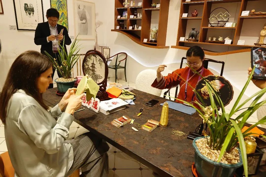 “非遗客厅”中不只有千姿百态的非遗项目,嘉定区的非遗传承人们也为客厅注入了异样的生机。“这个紫藤花法华塔屏风,选用的是双面异色绣,需求两根针、两根线、两只手在一块布上一起绣。”来自嘉定区马陆镇的“守演员”陈碧娴正向世界各地的媒体朋友介绍嘉定苏绣的精巧工艺。